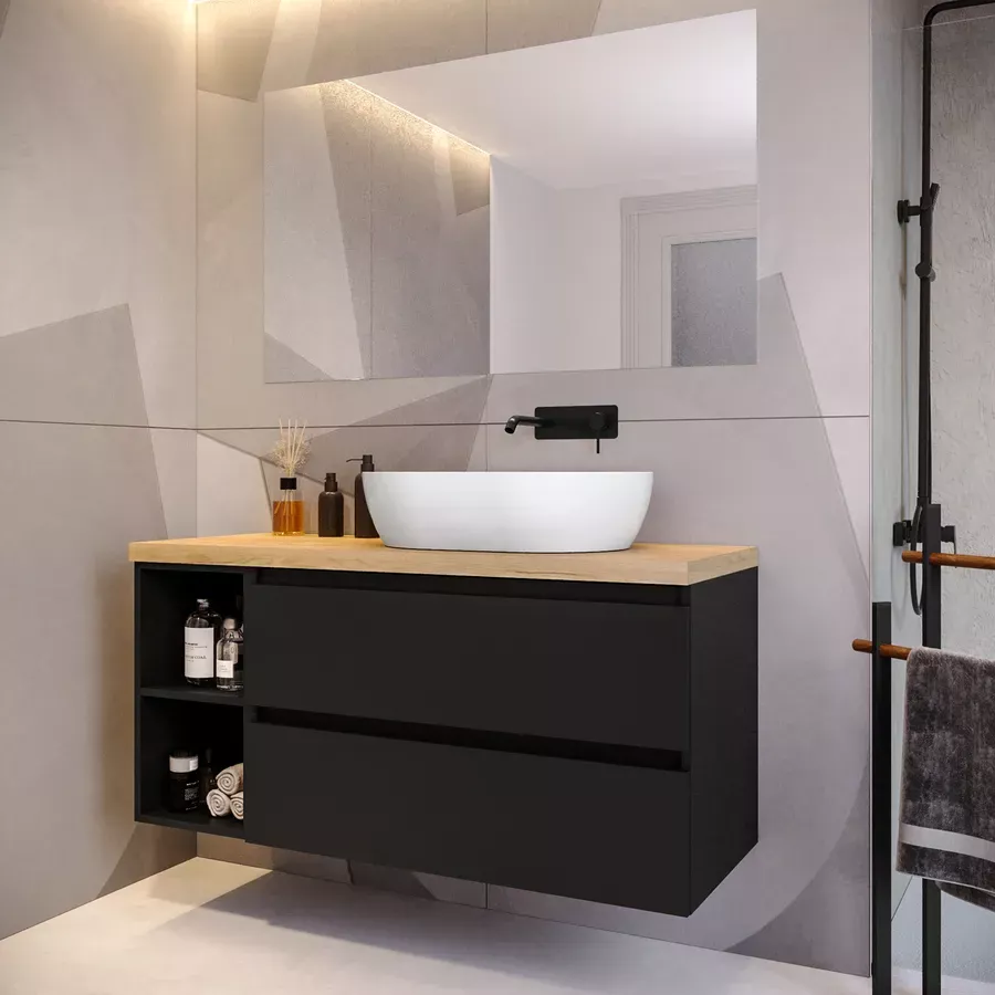 Mobile bagno sospeso 130 cm nero satinato con vano a giorno reversibile e top rovere gold con specchio